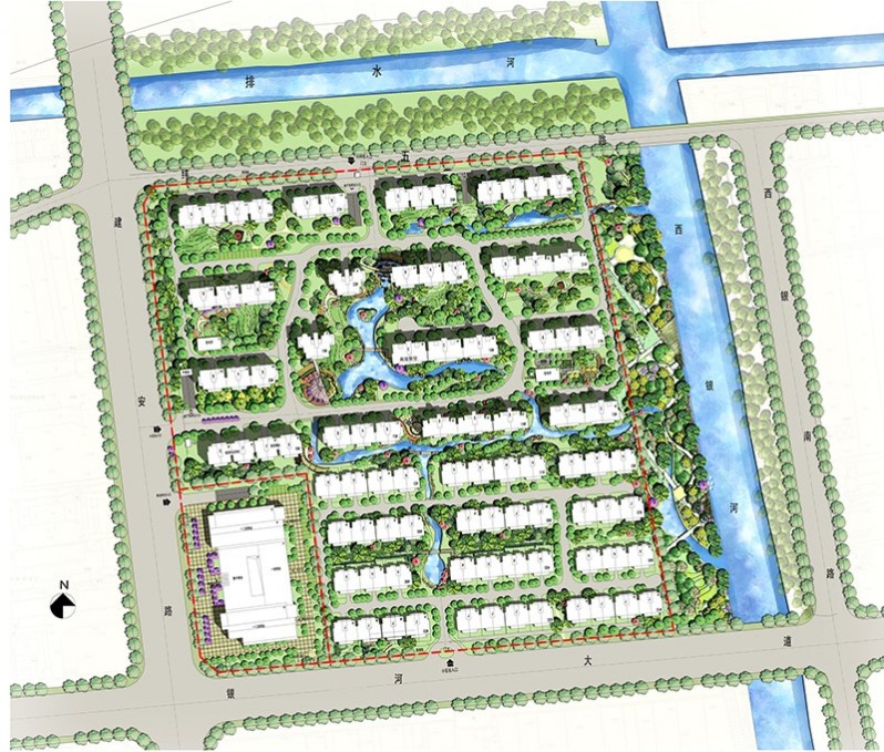 本地塊位于揚(yáng)州市西南分區(qū),寧通高速與建安路交叉口的東南角。北至規(guī)劃緯五路,南至銀河大道,西沿建安路,東側(cè)為西銀河及沿河景觀帶??偨ㄖ娣e16.41萬平方米。在總體的空間布局上,建筑由疊加洋房住宅和小高層住宅組成,整體上形成了南低北高的建筑態(tài)勢(shì)。并以一條景觀水系將兩者適當(dāng)分隔。立面風(fēng)格上以新古典風(fēng)格為基調(diào)并融入揚(yáng)州傳統(tǒng)建筑的元素,強(qiáng)調(diào)簡(jiǎn)潔明快的色彩效果。建筑形式和色彩與周圍環(huán)境協(xié)調(diào),并盡力打造良好的沿建安路,銀河大道的城市界面。